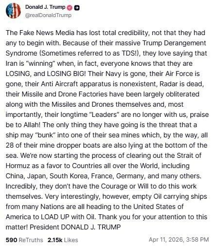#Trump le narcisse re-fanfarone : Nous commençons le processus déminage du détroit d'Ormuz "Nous commençons maintenant le processus déminage du détroit d'Ormuz en tant que service aux pays du monde entier, y compris la Chine, le Japon