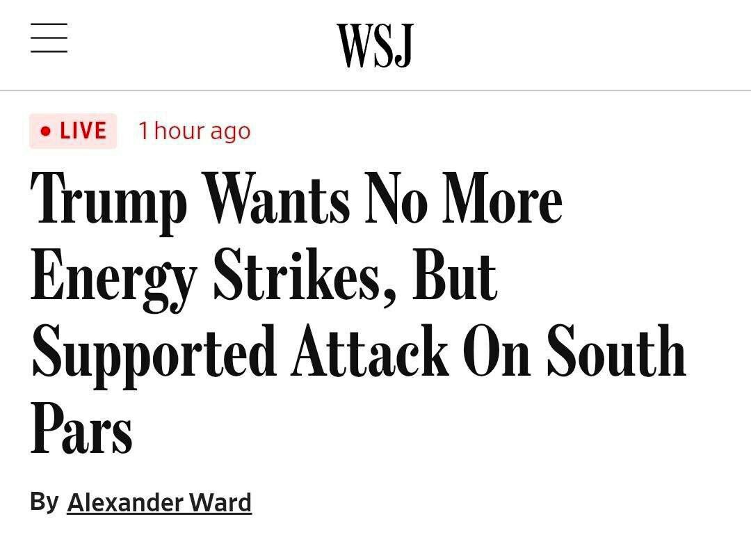 #Trump s'est opposé à de nouvelles frappes contre l'énergie iranienneSelon le WSJ, Donald Trump n'est pas favorable à de nouvelles attaques contre les installations énergétiques iraniennes après l'attaque israélienne sur le champ gazier de South