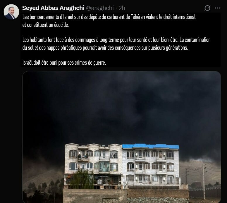 Le ministre iranien des Affaires étrangères, Abbas #Araghchi, a appelé à sanctionner #Israël pour les bombardements de #Téhéran, qui ont entraîné une pollution des sols et des nappes phréatiques. RT en français • Osez ques...
