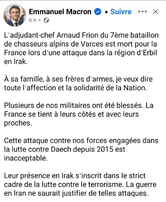L’adjudant-chef Arnaud Frion du 7ème bataillon de chasseurs alpins de Varces est mort pour la #France lors d’une attaque dans la région d’Erbil en Irak. À sa famille, à ses frères d’armes, je veux dire toute l’affection et la solidarité de la Nat...