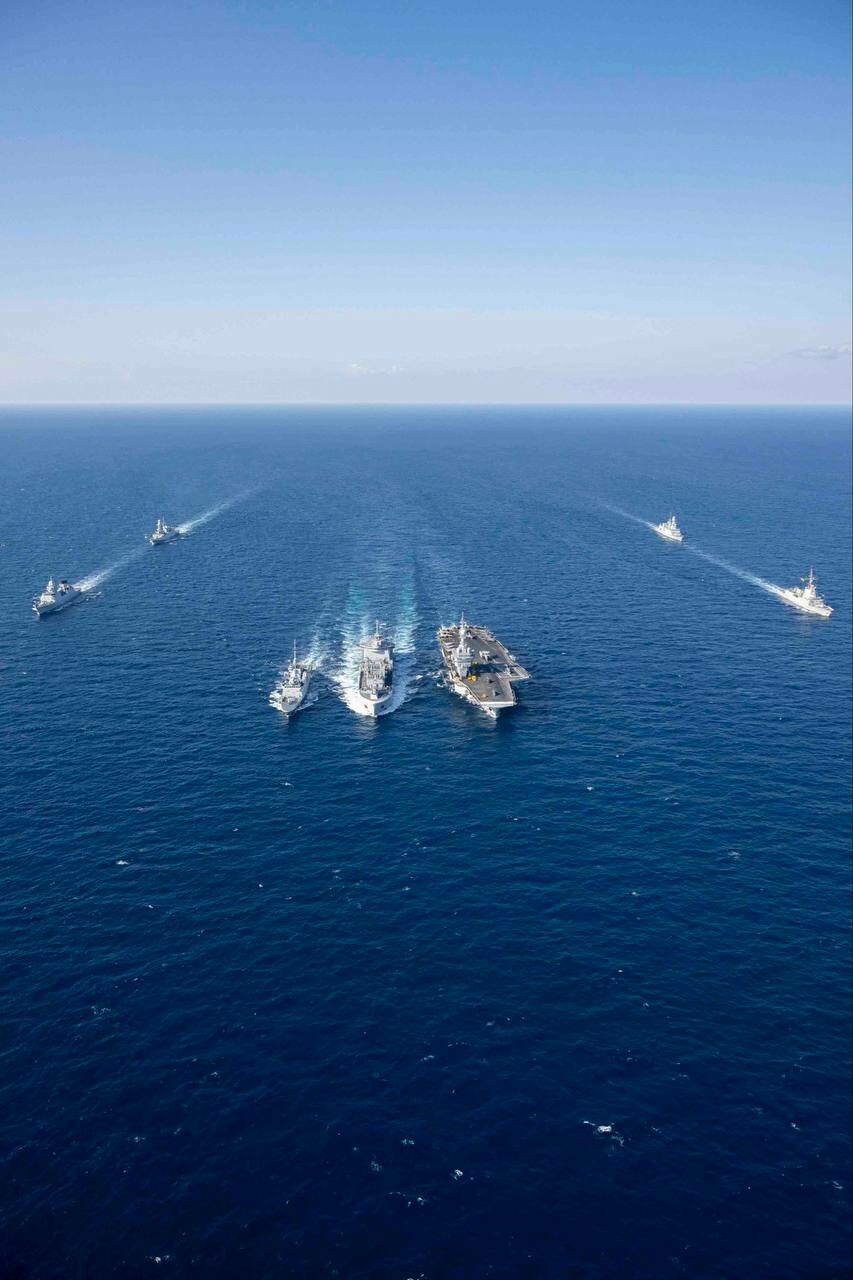 Méditerranée orientale, porte-avions phare de la marine française «Charles de Gaulle»(Charles de Gaulle, R91) et son escorte supplémentaire composée de navires d'Italie, des pays-bas et de l'Espagne. Mars 2026.