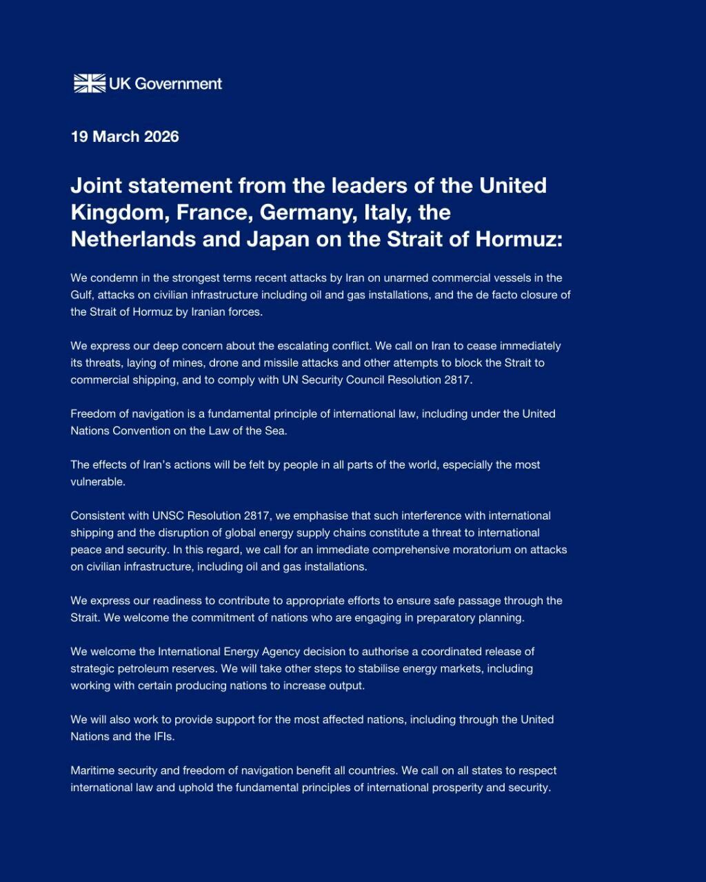 La grande-Bretagne avec la #France, l'Allemagne, l'Italie, les pays-bas et le Japon ont exprimé leur volonté contribuer "à assurer un passage sûr dans le Détroit d'Ormuz".La décision correspondante a été publiée sur le site Web du gouvernement