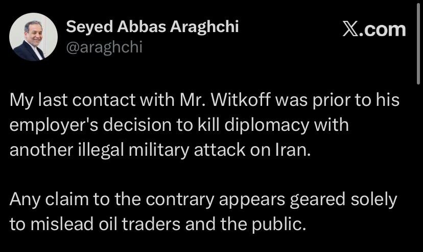 ️ - Le ministre iranien des Affaires étrangères, Abbas Araghchi, affirme qu'il n'y a pas #eu de communication avec Steve Witkoff, et que toute information prétendant le contraire est fausse et constitue une tentative de sauver les marchés pétroliers.
