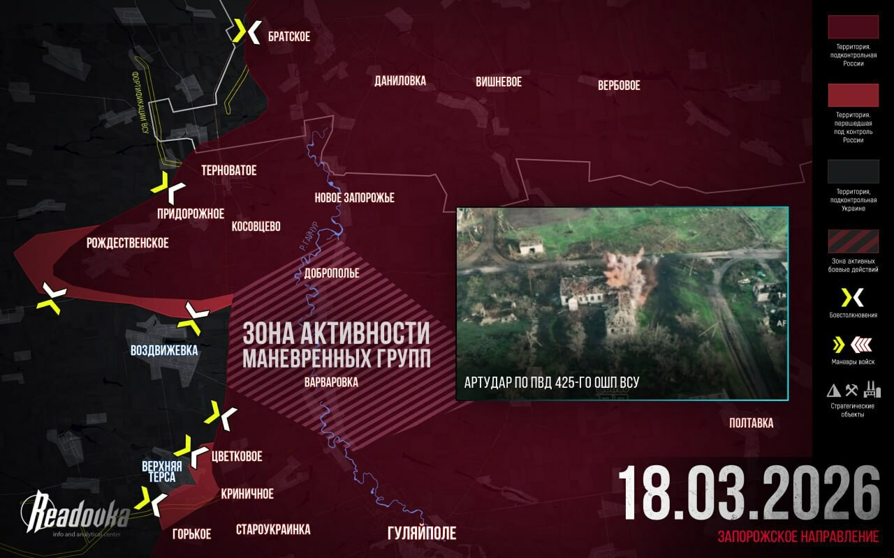 Chroniques de l'opération militaire spéciale pour le 18 mars 2026Les forces russes poursuivent les frappes de feu systématiques contre les infrastructures de transport. Dans la région de #Sumy