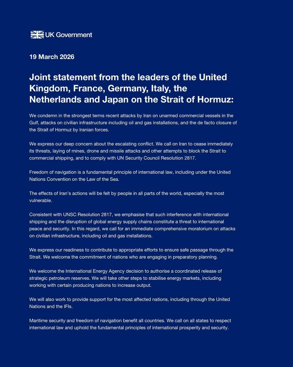 Le Royaume-Uni, la #France, l'Allemagne, l'Italie, les Pays-Bas et le Japon ont publié une déclaration commune exprimant leur volonté de contribuer aux efforts appropriés pour assurer le passage sûr de la navigation commerciale dans le détroit d