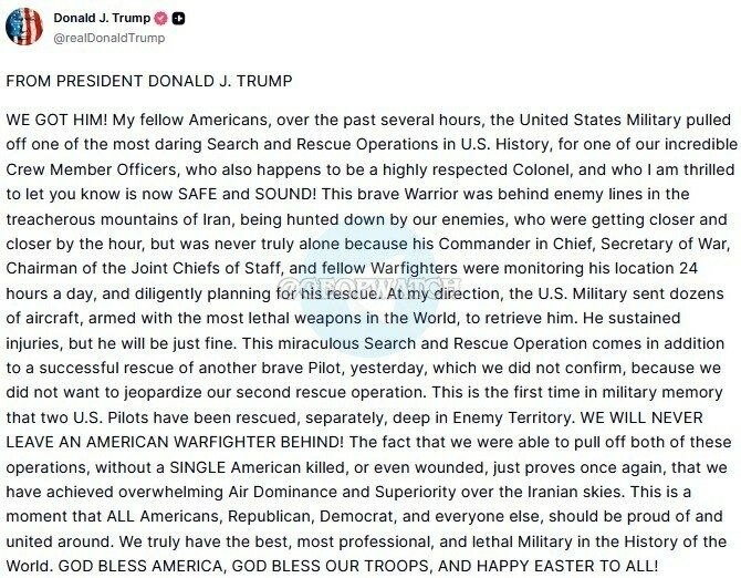❗️🇺🇸 - Le président #Trump annonce que le deuxième membre d'équipage du F-15 abattu est "maintenant SAIN ET SAUF". Le président a également révélé que les opérations ont été menées sans "un SEUL Américain tué, ni même blessé".