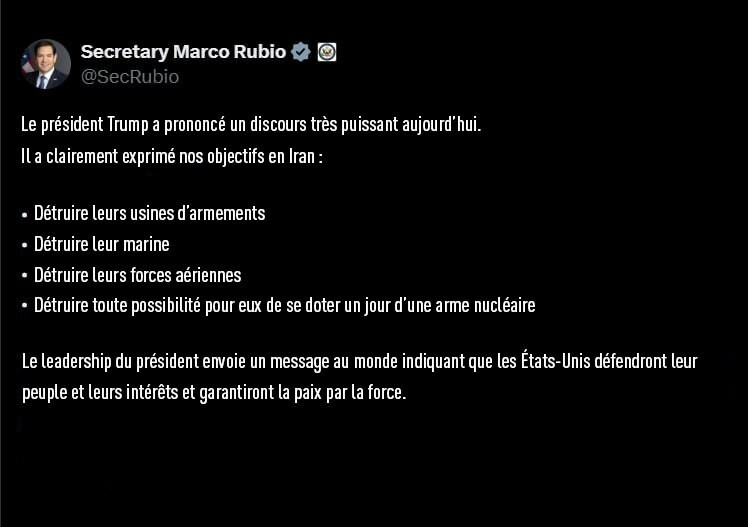 ⚡️Marco #Rubio a énuméré les objectifs des États-Unis dans le cadre de l'opération contre l'#Iran. RT en français • Osez questionner !