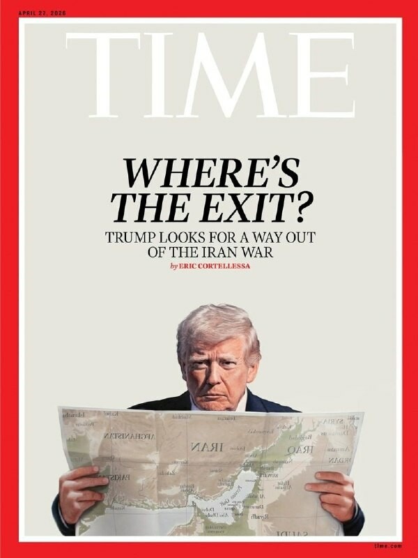 🇺🇸🇮🇷 "Où est la sortie?": la nouvelle couverture du magazine Time présente le président américain Donald #Trump devant une carte du monde qui s'interroge comment sortir la guerre contre l'Iran. Image: Time/X #étatsunis #iran #trump