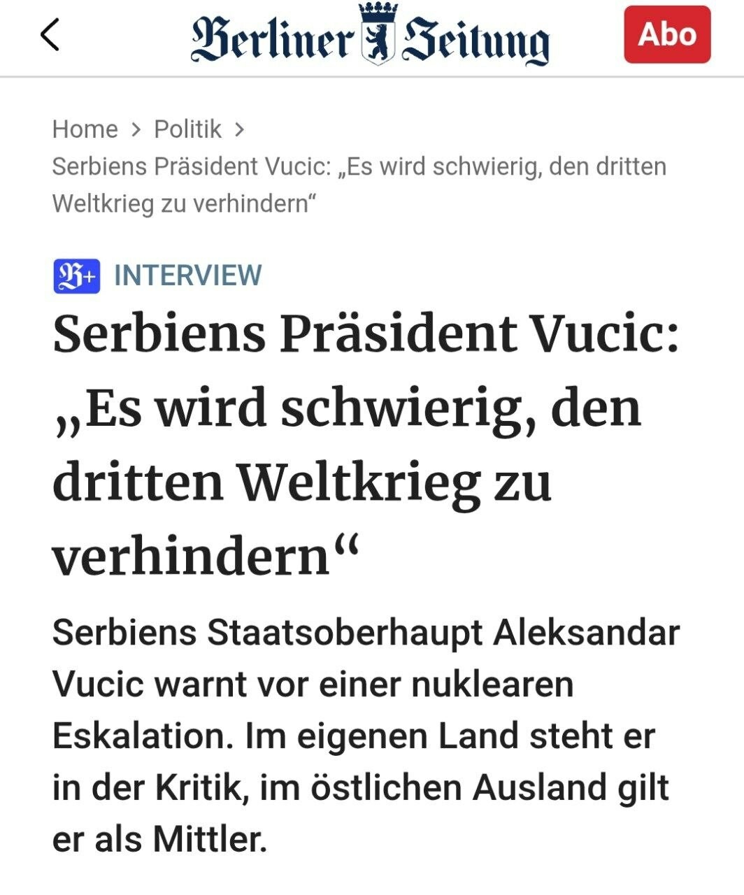 Berliner Zeitung: Le président serbe vucic a déclaré qu'il serait difficile d'éviter une Troisième guerre mondiale.Le président serbe Aleksandar vucic met en garde contre l'escalade du conflit nucléaire. Il est critiqué en interne