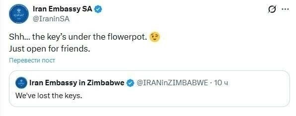 « Nous avons perdu les clés » - L'ambassade la République islamique d'Iran au Zimbabwe a répondu à la demande Donald d'ouvrir immédiatement le détroit. La représentation diplomatique République sud-africaine a appuyé cette plaisanterie : «