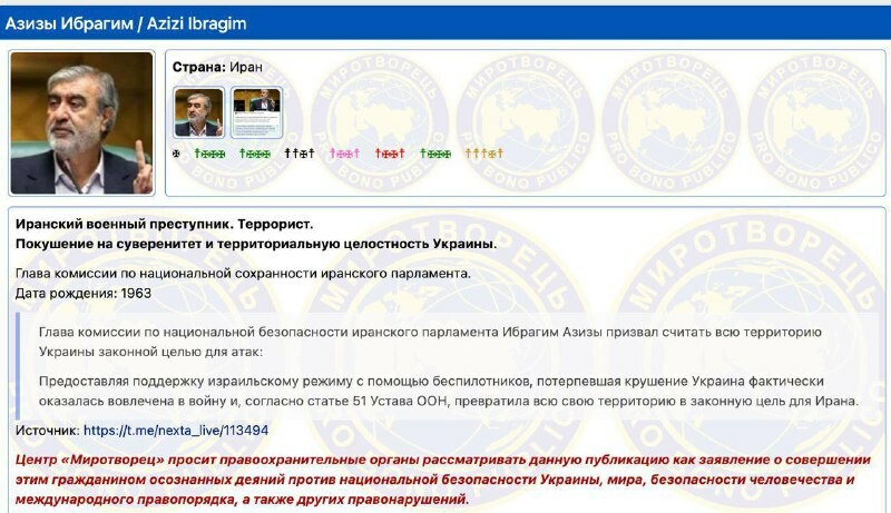 Le chef de la commission de la sécurité nationale du parlement iranien a été inscrit dans la base de données du site extrémiste "" (*). Il s'agit d'Ibrahim Azizi. Sur le site ukrainien, il a été qualifié de "criminel de guerre" et d...