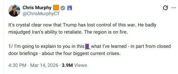 Chris Murphy, sénateur américain : a perdu le contrôle de cette guerre. Il a grandement sous-estimé la capacité de l'Iran à riposter. La région est en proie au chaos.