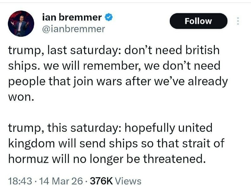 , samedi dernier : Nous n'avons pas besoin de navires britanniques. Nous n'oublions pas et nous n'avons pas besoin de ceux qui se joignent aux guerres après notre victoire. Trump, ce samedi : J'espère que la Grande-Bretagne enverra des na...