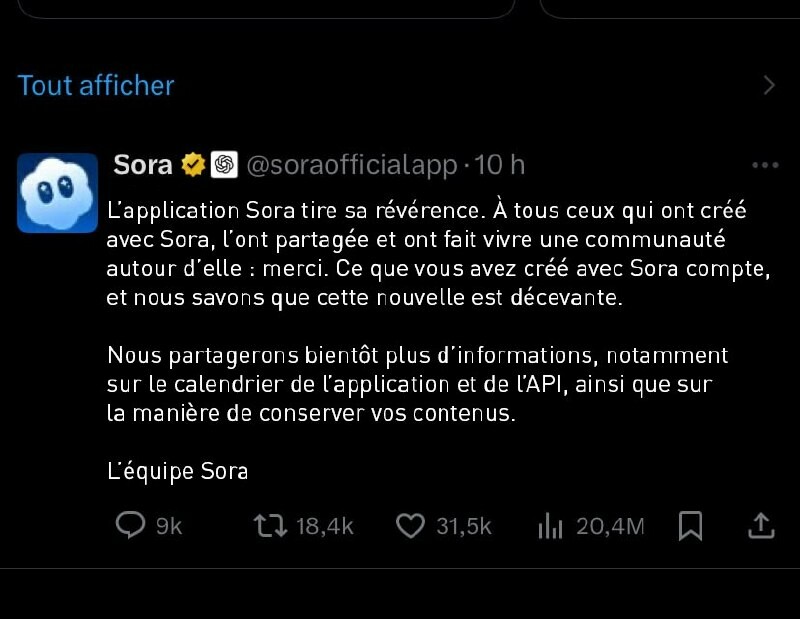 abandonne Sora et son accord avec Disney OpenAI ferme son application Sora et annule un partenariat de 1 milliard de dollars avec , moins de quatre mois après son lancement.