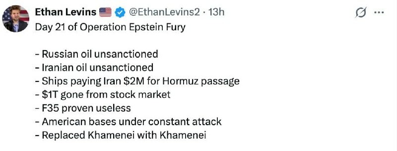 Le journaliste américain Ethan Levins a dressé un bilan intermédiaire de la guerre des États-Unis et d'Israël contre l'Iran. « Jour 21 de l'opération " Fury" » Le pétrole russe n'est plus sous
