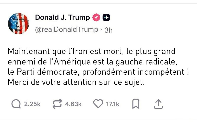🇺🇸 affirme qu'après la « mort » de l', le Parti démocrate est désormais le « plus grand ennemi » des États-Unis. C'est ce qu'il a écrit sur sa page Truth Social. RT en français • Osez questionner !