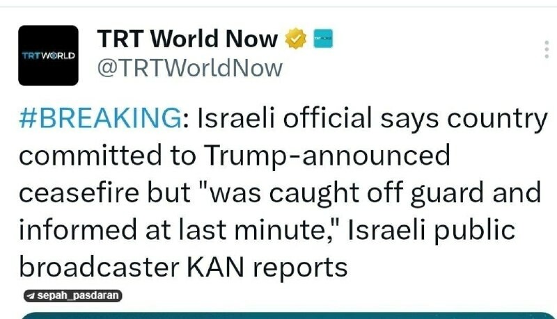 Un représentant du régime israélien a déclaré : nous avons été pris de court, mais nous respectons le cessez-le-feu annoncé. La chaîne israélienne "Kan", citant un représentant : Tel-Aviv respecte le cessez-le-feu annoncé par #Trump