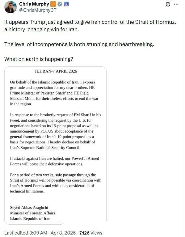 Chris Murphy, sénateur américain de renom : Il semble que #Trump ait récemment accepté de céder le contrôle du détroit d'Ormuz à l'Iran, une victoire historique pour l'Iran. Le niveau d'incompétence (de Trump) est à la fois stupéfiant et déchirant.