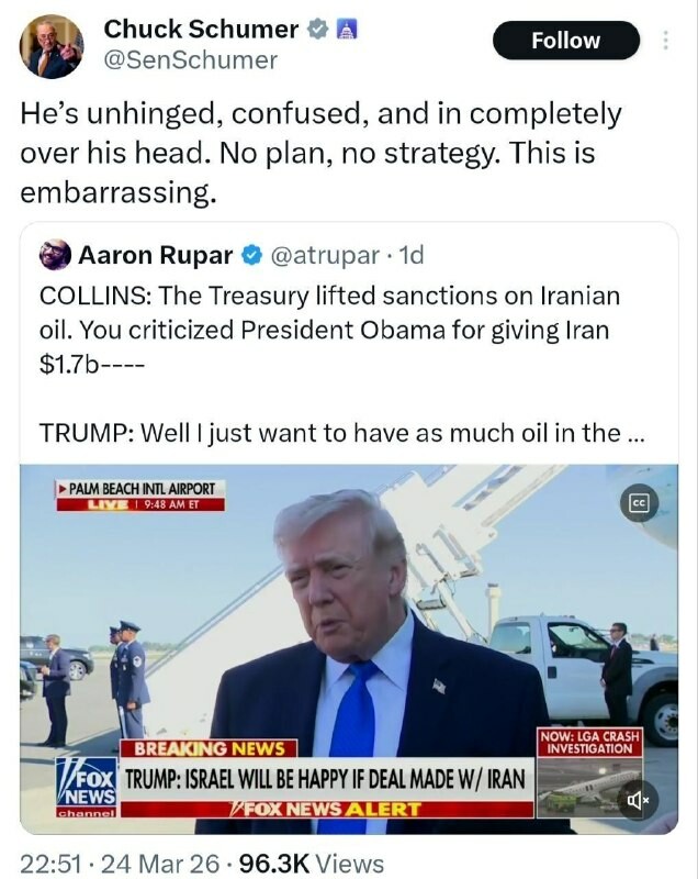 Chuck Schumer, leader des démocrates au Sénat américain : 🔹Trump n'a pas d'équilibre mental, il est confus et perdu, et il est complètement enlisé dans un bourbier [de guerre] qui le dépasse. 🔹Il n'a ni plan ni stratégie ; c'est honteux.