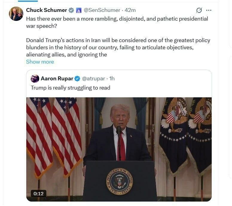 Chuck Schumer, chef des démocrates au Sénat : Un président a-t-il déjà prononcé un discours guerre plus hors sujet, incohérent et déconnecté ?