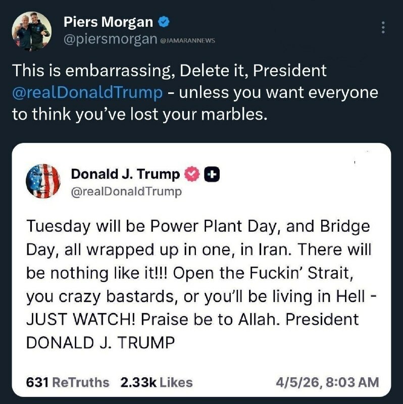 La réaction d'un célèbre animateur anglais à la menace de #Trump contre les infrastructures iraniennes : Supprime ce post ! À moins que tu veuilles qu'on pense que tu as perdu la raison Piers Morgan, animateur et journaliste anglais célèbre