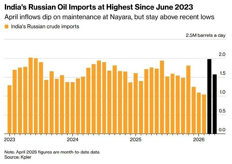 L'Inde augmente ses importations de pétrole russe au maximum depuis juin 2023 Les livraisons de pétrole russe Inde mars ont atteint 1,98 million de barils par jour, soit le niveau le plus élevé depuis juin 2023, selon Bloomberg.