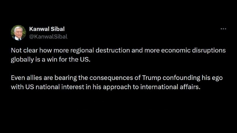 Réaction intéressante l'ancien vice-ministre des Affaires étrangères l'Inde à la prétendue victoire dans la guerre contre l'Iran Kanwal Sibal : Il n'est pas clair comment une destruction accrue la région et un désordre économique plus