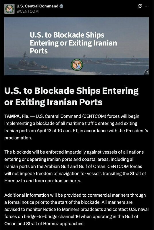 Les États-Unis ont fixé la date du blocus naval des ports iraniens «Le Commandement central des États-Unis a annoncé qu'à partir du 13 avril à 10 heures du matin heure de l'Est, les États-Unis assureraient un blocus naval de tous les navires entrant