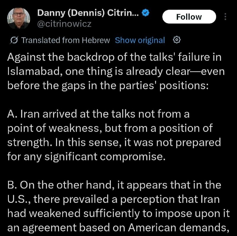 Analyse l'ancien responsable du bureau #Iran au renseignement militaire israélien sur l'avenir la guerre après l'échec des négociations Dani Citrinovich : Un point est clair dès maintenant : l'Iran est entré dans les négociations non pas position