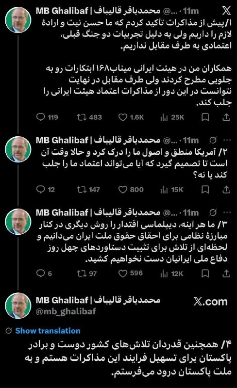 Qalibaf said: 1. Before the negotiations, I confirmed that we have good intentions and the necessary will, but due to the experiences of the previous two wars, we do not trust the other side.