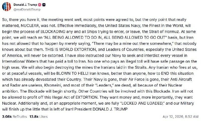 : EFFECTIVE IMMEDIATELY, UNITED STATES NAVY WILL BEGIN PROCESS OF BLOCKADING ANY AND ALL SHIPS TRYING TO ENTER, OR LEAVE, STRAIT OF .