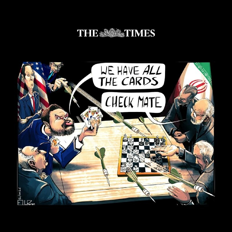 A cartoon from The Times depicting the negotiating table in Islamabad In this cartoon, #Iran views the negotiation as a chess game and has checkmated America. But America is playing cards; though inexperienced, it has shown its cards