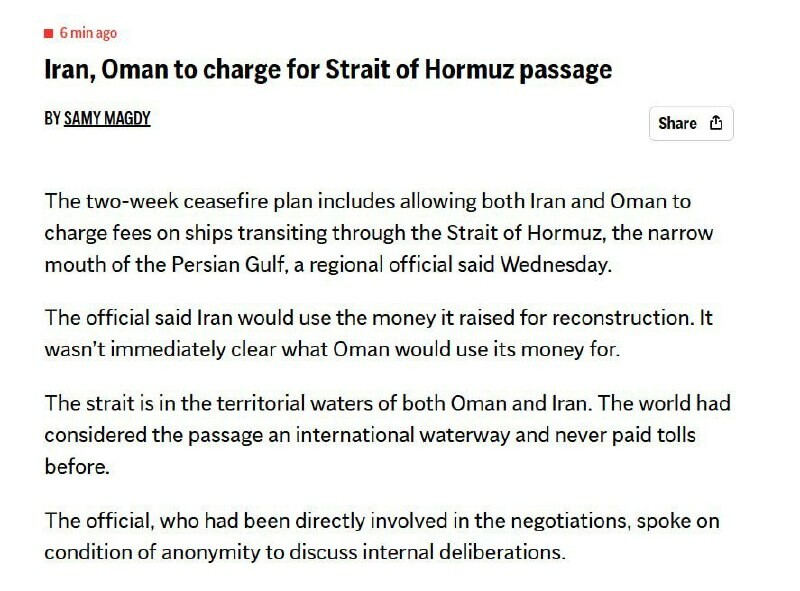 Bulletin d'information TASS, 6 avril: Téhéran a préparé et transmis à Islamabad sa réponse à la proposition de trêve de Washington Téhéran ne reprendra pas le libre passage des navires dans le détroit d’Ormuz échange