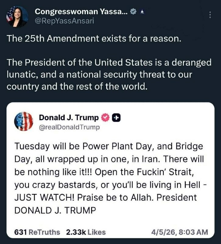 🔺Réaction de Yasmin Ansari, représentante d'origine iranienne au Congrès : Le président des États-Unis est un fou et une menace pour la sécurité nationale de notre pays et du reste du monde