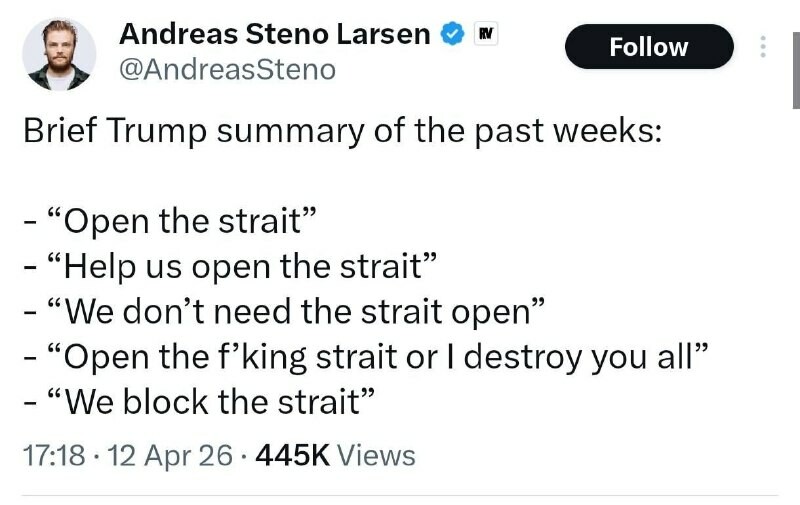 Récit d'un analyste danois sur les contradictions de Résumé bref des positions de Trump ces dernières semaines : Ouvrez le détroit. Aidez à ouvrir le détroit. Nous n'avons pas besoin que le détroit soit ouvert.