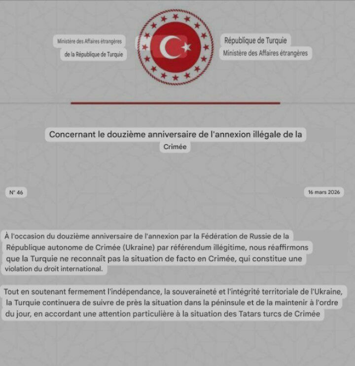"La Turquie a déclaré ne pas reconnaître l'annexion de la Crimée par la Russie"- Ministère turc des Affaires étrangères -Dans un communiqué marquant le 12e anniversaire des événements de Crimée, Ankara a souligné qu'elle considère le référendum d...