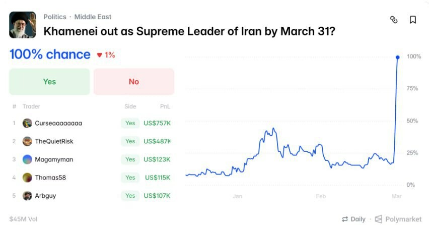 Guerre en #Iran, rumeurs concernant des spéculations cryptoplateforme« L'attaque menée par les États-Unis et Israël contre l'Iran est devenue l'un des événements les plus marquants de l'histoire de la cryptoplateforme de prédiction Polymarket.