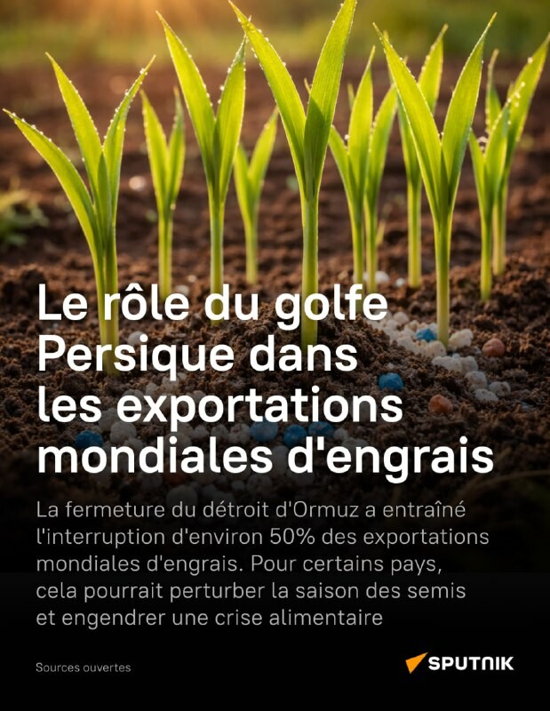 Le rôle du golfe Persique dans les exportations mondiales d'engrais Cette infographie de Sputnik montre quels pays pourraient être touchés par une crise alimentaire alors qu'environ la moitié des livraisons mondiales d