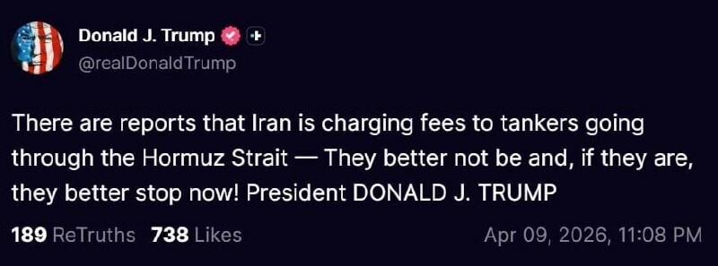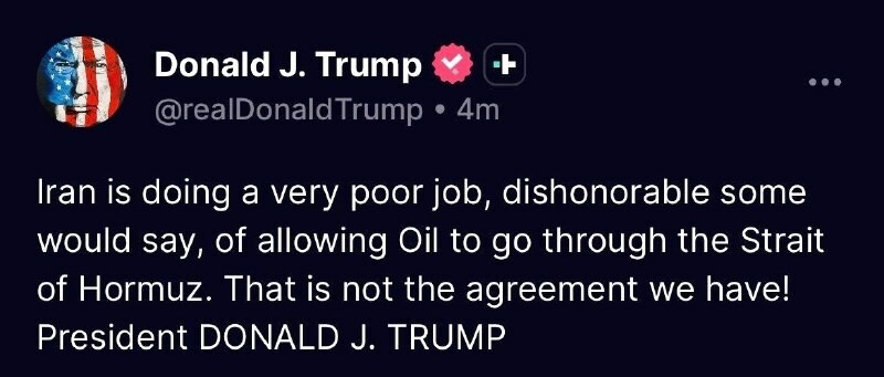 Dans un autre post sur son application Truth Social, le président américain Donald J. #Trump a déclaré que les actions l'Iran, ce qui concerne la facturation frais pour le transit par le détroit d'Hormuz, "ne sont pas l'accord que nous avons".