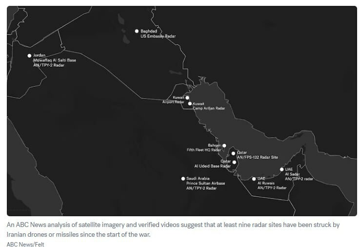 L’Iran a touché au moins 10 fois des sites radar américains et alliés au Moyen-Orient Une analyse d’ABC News, basée sur des images satellites et des vidéos authentifiées, suggère qu’au moins 10 sites radar ont été touchés par des drones ou des