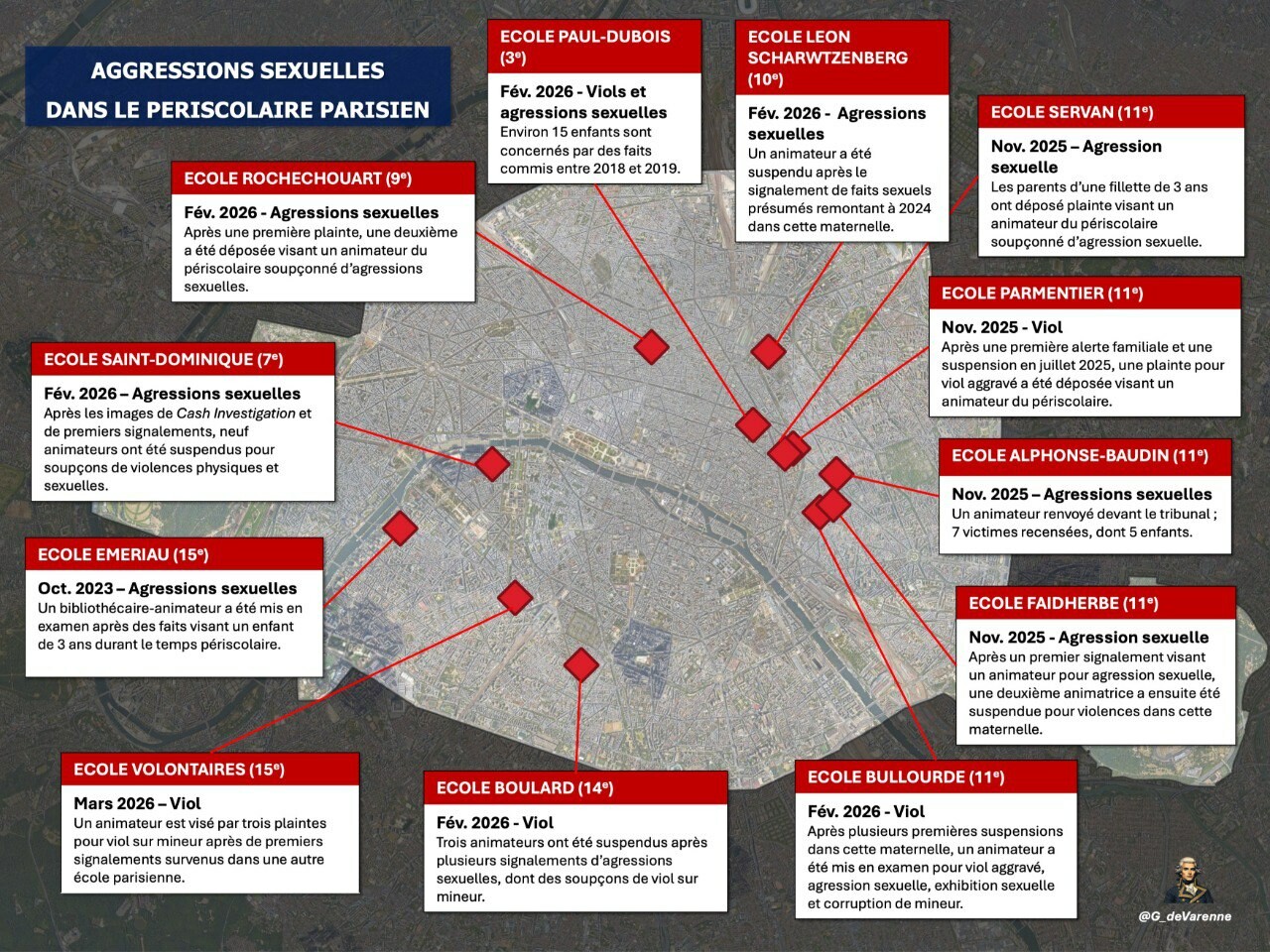 Périscolaire parisien : cartographie des écoles visées par des affaires d’agressions sexuelles et de viols(L’ensemble de ces cas recensés a été révélé par la presse.)