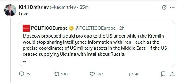 Le représentant spécial du Kremlin, Kirill #Dmitriev , a qualifié de « fake » la publication de Politico affirmant que la Russie aurait proposé aux États-Unis de cesser de transmettre des renseignements à l’ #Iran si #Washington faisait de même avec