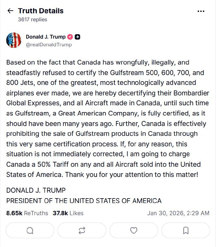 #Trump annonce la décertification de « tous les avions fabriqués au #Canada » en réponse au refus du Canada de certifier les jets Gulfstream. Il menace également d'imposer un « droit de douane de 50 % sur tous les avions v