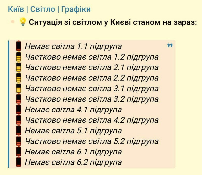 A #Kiev, deuxième journée de black-out, selon les données des pages Facebook de la capitale qui suivent la situation de l'électricité. Selon leurs données, actuellement, tous les groupes électriques sont soit totalement hors service, soit ils ne
