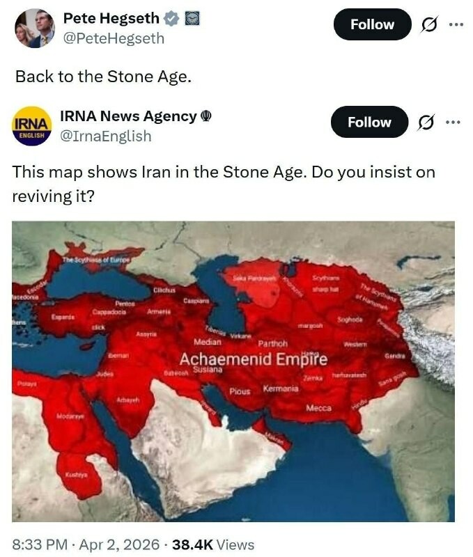 Пит, а ты уверен? В ответ на глумливое «Назад в каменный век!», адресованное Тегерану главой Пентагона Питом Хегсетом, иранское информационное агентство IRNA опубликовало пост с подписью: «На этой карте показан Иран в Каменном Веке. Ты уверен