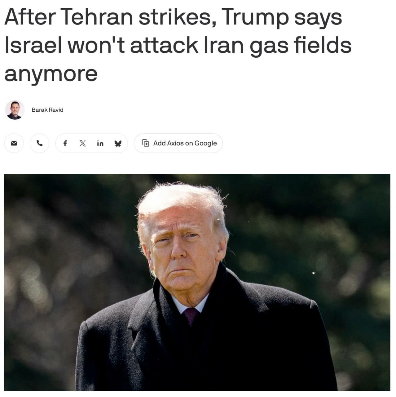 Axios, citant des sources, rapporte que ment lorsqu'il affirme ne pas avoir connaissance des intentions d'Israël d'attaquer le champ gazier iranien de South Pars.Après la première frappe de missile iranienne de représailles [contre