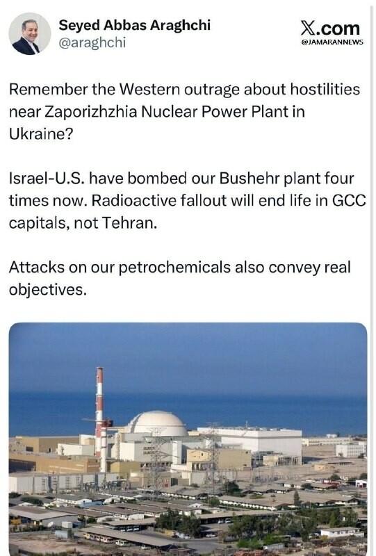 La réaction d'Araghchi aux attaques des États-Unis et d'Israël contre la centrale nucléaire de Bouchehr Vous vous souvenez de la réaction brutale et massive de l'Occident aux affrontements près de la centrale nucléaire de Zaporijia en #Ukraine ?