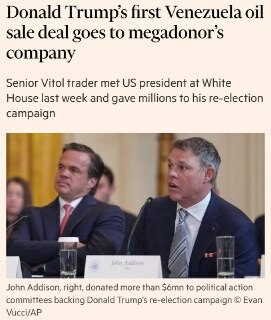 La première vente américaine de pétrole vénézuélien est allée à Vitol, une entreprise dont le trader principal, John Addison, a donné environ 6 millions de dollars à la campagne de réélection de #Trump et a récemment rencontré Trump à la Maison Bl