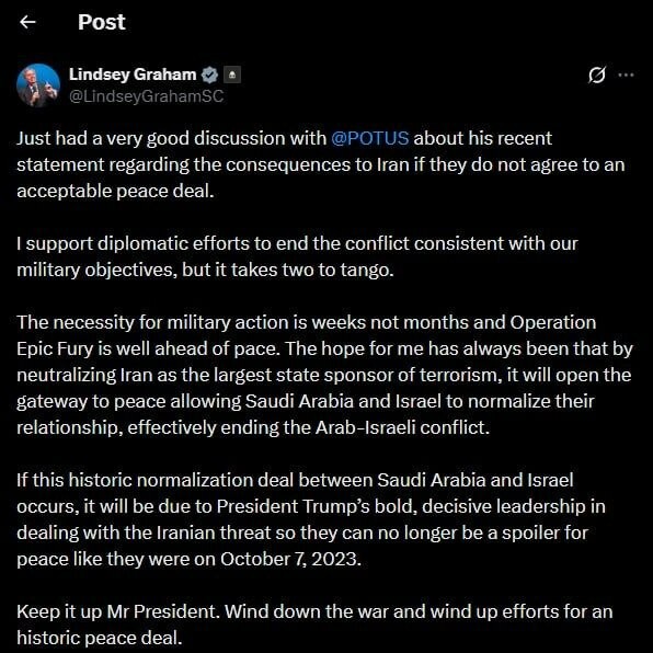 Le sénateur américain Lindsey Graham : "Je viens d'avoir une très bonne discussion avec @POTUS au sujet de sa récente déclaration concernant les conséquences pour l'Iran s'il n'accepte pas un accord de paix acceptable.