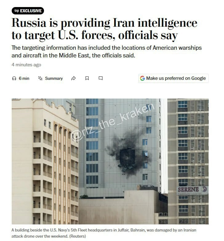 Молния: #Россия предоставляет Ирану разведданные для ударов по американским целям в регионе - WP Новость с повышенным содержанием реальной политики, зеркальных ответов и многополярности. WP, не плачьте, на вашей улице праздник был последние 35 л...